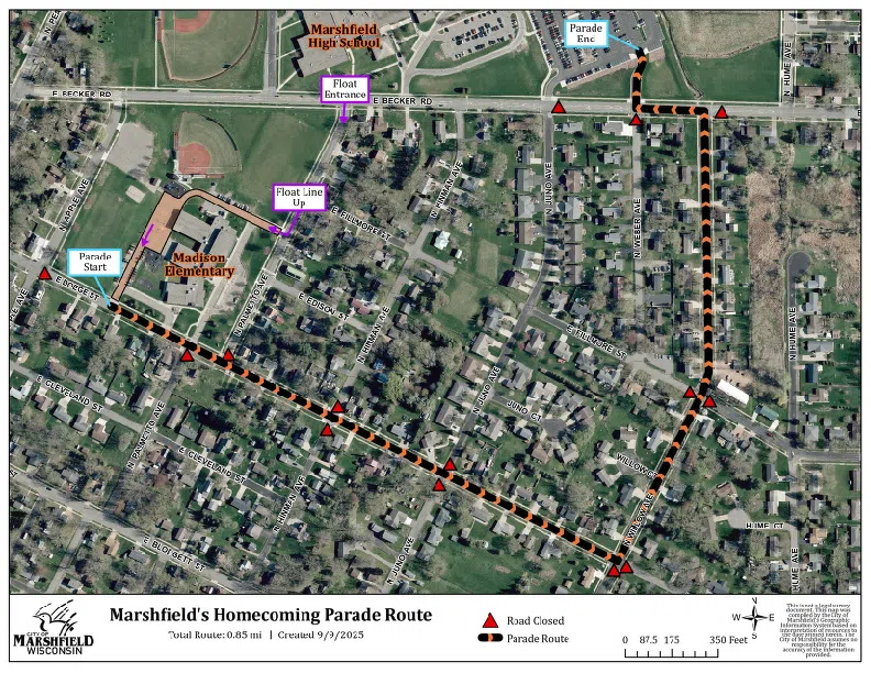 On Friday, October 3, 2025, road closures will be in effect for the Marshfield High School Homecoming Parade, which begins at 5:00 p.m.