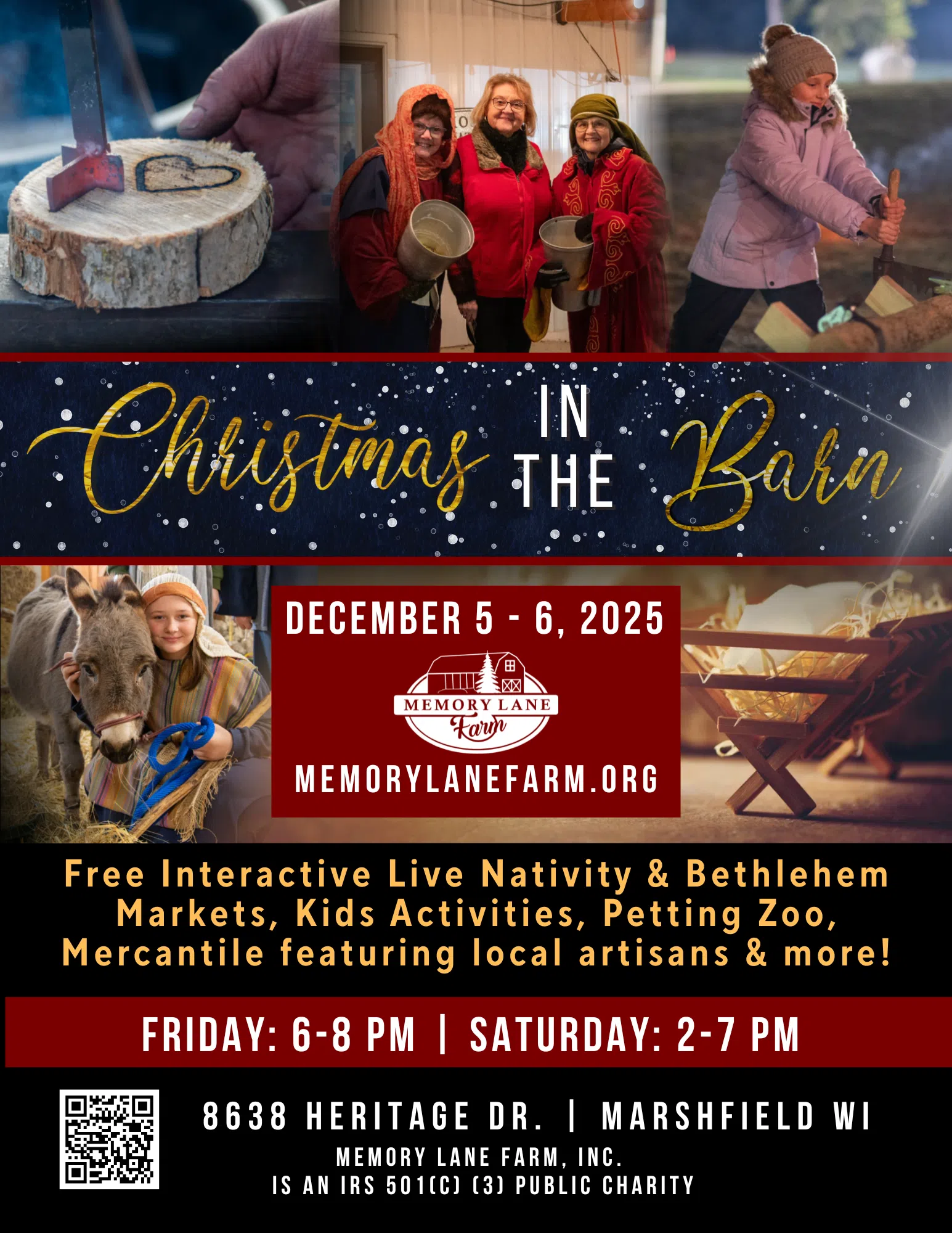 Experience the wonder of Christmas at Memory Lane Farm’s “Christmas in the Barn” being held Friday, December 5th, from 6–8 PM, and Saturday, December 6th, from 2–7 PM.