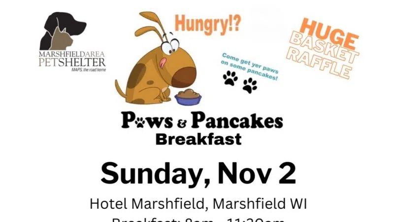 The Marshfield Area Pet Shelter (MAPS) is excited to host its annual Paws & Pancakes Breakfast Fundraiser on Sunday, November 2, from 8:00 a.m. to 11:30 a.m. at Hotel Marshfield (2700 S Central Ave). Guests will enjoy a delicious breakfast buffet featuring scrambled eggs, pancakes, sausage, breakfast potatoes, cinn...
